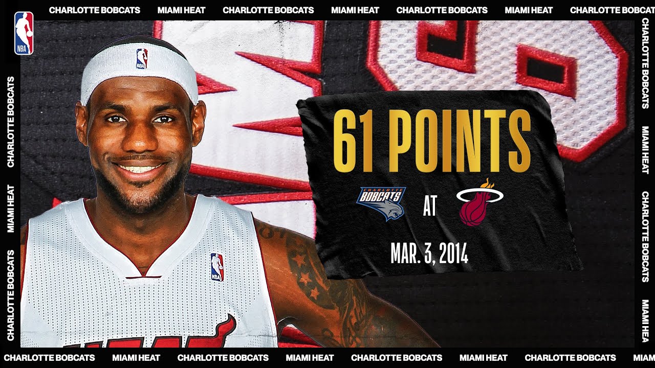 OKC (24-1) 03h00Le 3 Mars 2014, le Heat de Miami recevait les Bobcats de Charlotte. Ce jour là, LeBron James prend feu et écoeure la défense de la franchise de Michael Jordan. Le King réalise son record de points en carrière avec 61 points à l'arrivée.