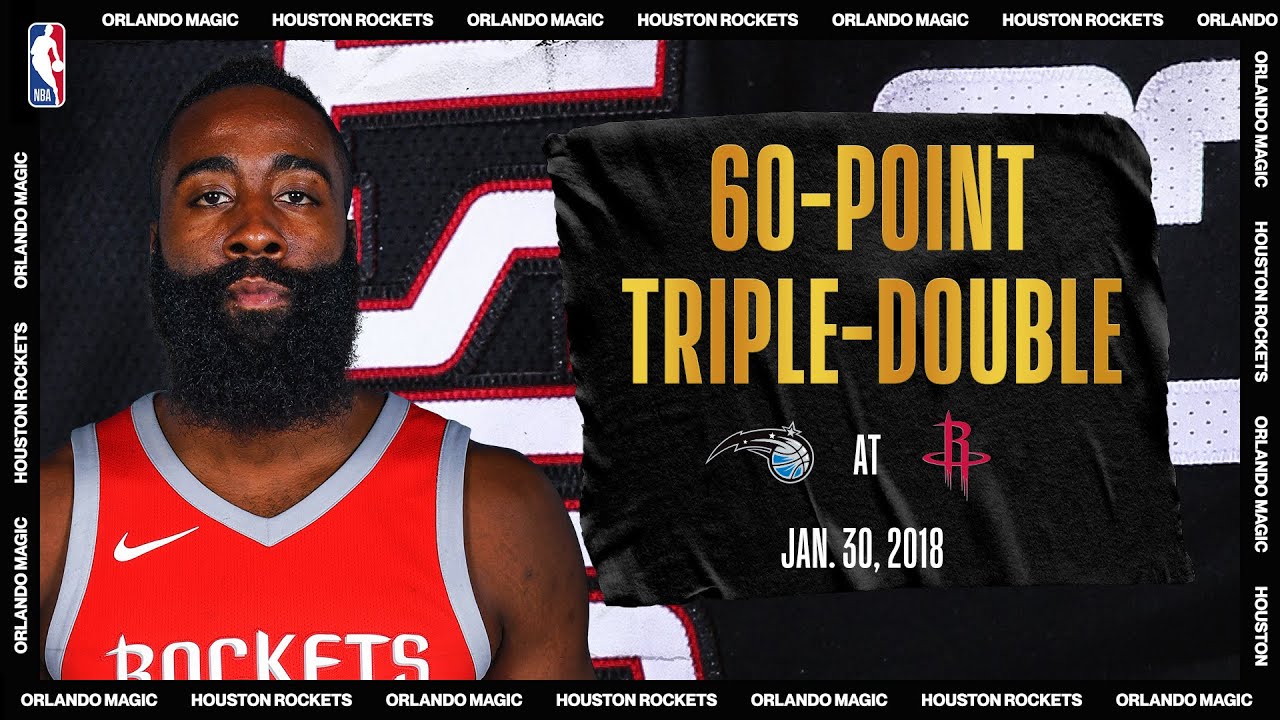 En réception du Magic d'Orlando au Toyota Center de Houston le 30 Janvier 2018, James Harden sort une statistique fulgurante, le premier triple double de l'histoire avec 60 points.