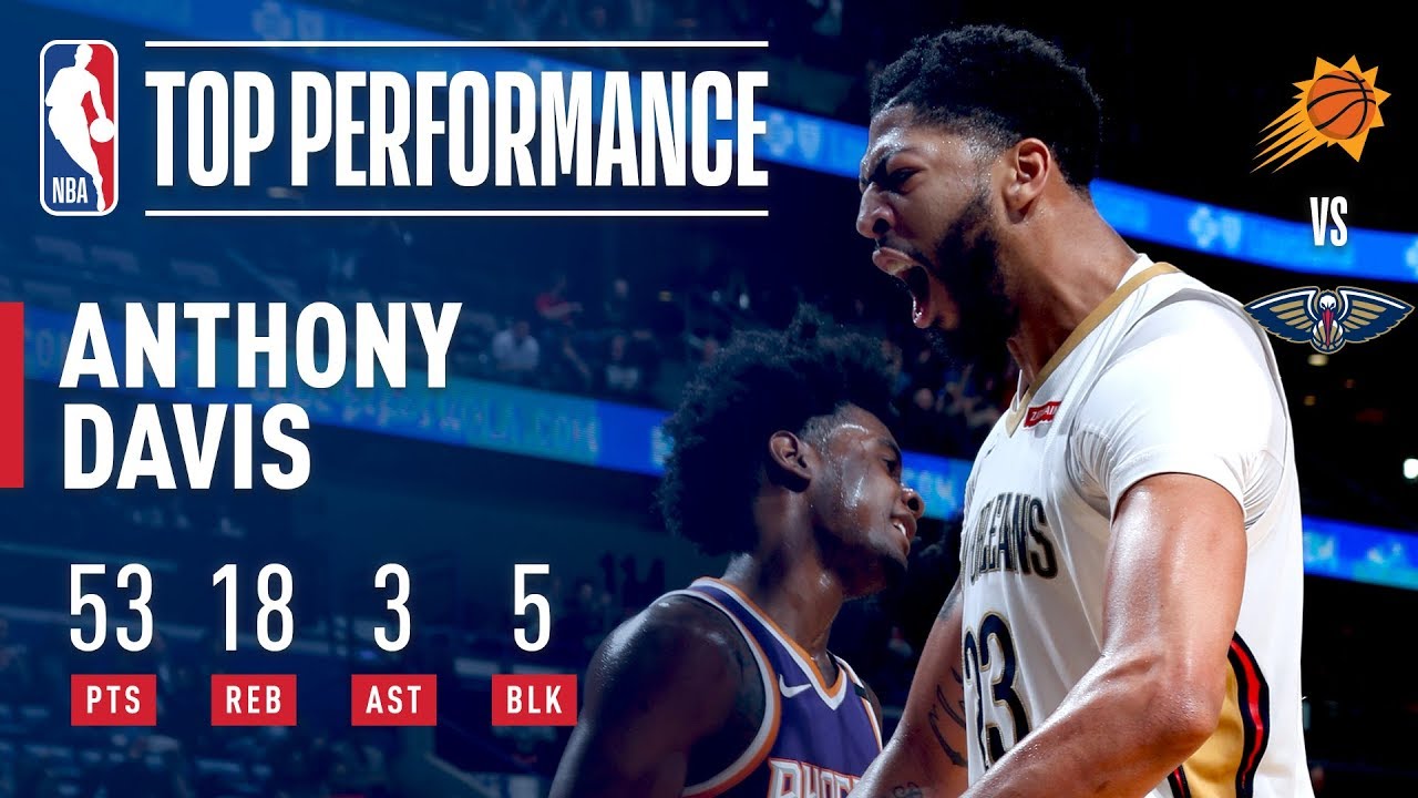 NOP 116Auteur de 53 points à 16/29 aux tirs, 21/26 aux lancers francs, 18 rebonds, 5 contres et 3 passes décisives, Anthony Davis prouve une nouvelle fois tout son talent. Phoenix ne résiste pas et s'incline 125 à 116. Davis rejoint également la légende Bob McAdoo comme étant un joueur ayant inscrit au moins 50 points, 15 rebonds et 5 contres.