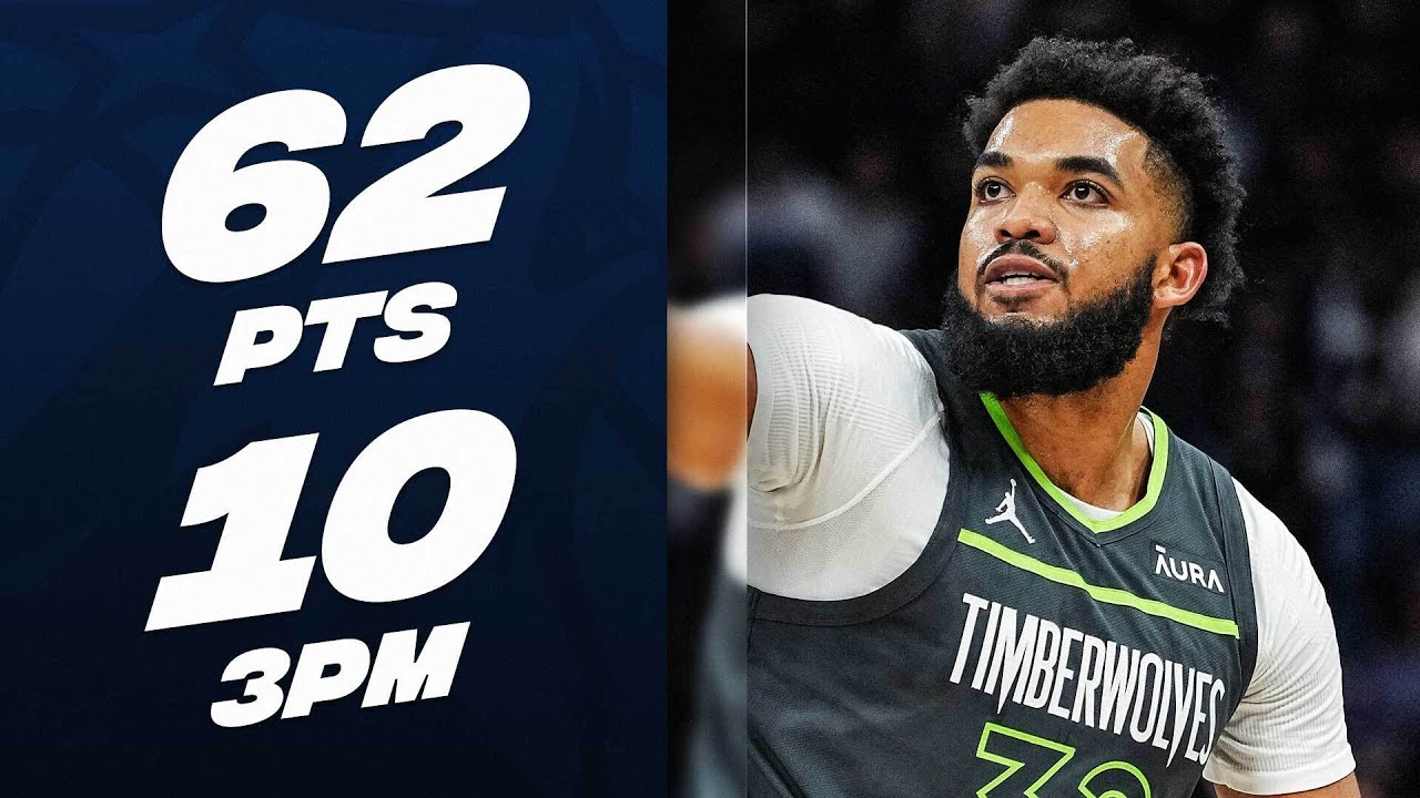 MIN (32-21) 21h00Malgré un nouveau record de franchise pour Karl-Anthony Towns, les Timberwolves ne parviennent pas à se défaire des Hornets 128 à 125. KAT score la bagatelle de 62 points (dont 44 en première mi-temps) à 21/25 aux tirs dont 10/15 à trois points, 10/14 aux lancers francs, 8 rebonds mais aussi 7 ballons perdus en 38 minutes de temps de jeu. Si la victoire avait été au bout, il aurait pu presque faire une bribe d'ombre aux 70 points de Joel Embiid.
