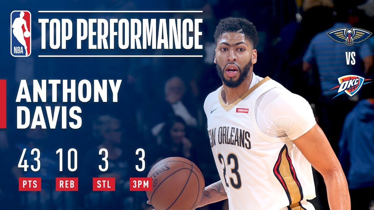 NOP 116Dans la victoire des Pelicans face au Thunder 114 à 100, Anthony Davis massacre la défense d'Oklahoma City en inscrivant 43 points à 17/34 aux tirs, 3/6 à trois points, 6/8 aux lancers francs, 10 rebonds et 3 interceptions. New Orleans affiche un bilan prometteur de 28 victoires et 23 défaites, soit une 7ème place de la Conférence Ouest. Oklahoma City reste 5ème à l'Ouest avec 30 victoires et 23 défaites.