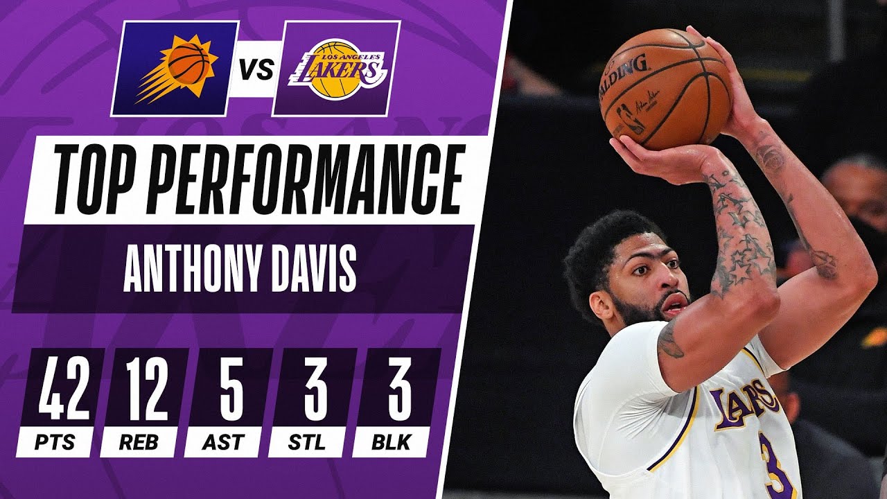 Dans la victoire des Lakers sur les Suns 123 à 110, Anthony Davis rassure et assure avec pas moins de 42 points à 13/27 aux tirs dont 1/5 à trois points, 15/17 aux lancers francs, 12 rebonds, 5 passes décisives, 3 interceptions et 3 contres en 41 minutes de temps de jeu.
