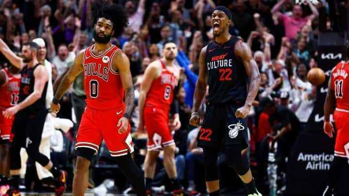 La revanche d'il y a deux jours s'est finalement soldée par une victoire du Heat. Accrochés au deuxième quart-temps, le score est à égalité à la mi-temps. Après un troisième quart en faveur de Miami, les Bulls remontent et s'accrochent. Le money time est serré et Coby White (22 points, 7 rebonds, 5 passes) marque un panier à trois points important à deux minutes de la fin. Chicago mène de deux. Jaime Jacquez Jr (18 points, 5 rebonds) égalise avec un dunk plein d'energie. White donne l'avantage aux siens sur un tir contre la planche. DeMar DeRozan (27 points, 5 passes) s'emmêle les pinceaux sur la possession suivante et Jimmy Butler (28 points) lui chippe le balon. Lay-up de Kyle Lowry (10 points, 7 passes) qui permet de rester à égalité. Jimmy Buckets garde la balle et inscrit le premier buzzer beater de la saison avec un step back dans la raquette. Kevin Love, toujours en renfort en sortie de banc, inscrit 22 points et 7 rebonds. Miami remonte à la sixième place tandis que les Bulls affichent 37% de victoire à la douzième place.