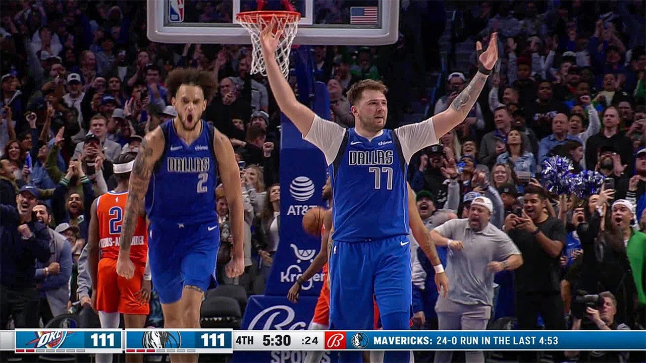 MIN 96 (32-22) Malgré une remontée de 30 points (30 à 0 !) dans le 4ème quart-temps (il faut remonter en 1996-97 pour voir cela, 111 à 87 puis 111-117), les Mavericks s'inclinent face au Thunder 126 à 120. On salue la performance XXL de Luka Doncic (36 points, 18 passes décisives et 15 rebonds), qui égale un certain Larry Bird à la 9ème place du nombre de trible double de l'histoire. Il s'agit du 3ème triple double pour le Slovène cette saison et du 59ème en carrière. À noter l'absence de Kyrie Irving dans ce match. Pour le Thunder, Jalen Williams termine à 23 points, 17 points, 9 passes et 5 interceptions de Shai Gilgeous-Alexander.