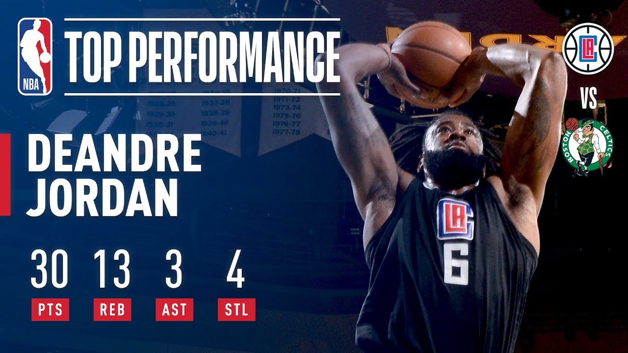 HOU (34-21) 03h30Avec 30 points à 11/14 aux tirs, 8/9 aux lancers francs, 13 rebonds, 4 interceptions, 3 passes décisives en 32 minutes de temps de jeu, DeAndre Jordan domine la raquette de Boston et les Clippers repartent une victoire inattendue.