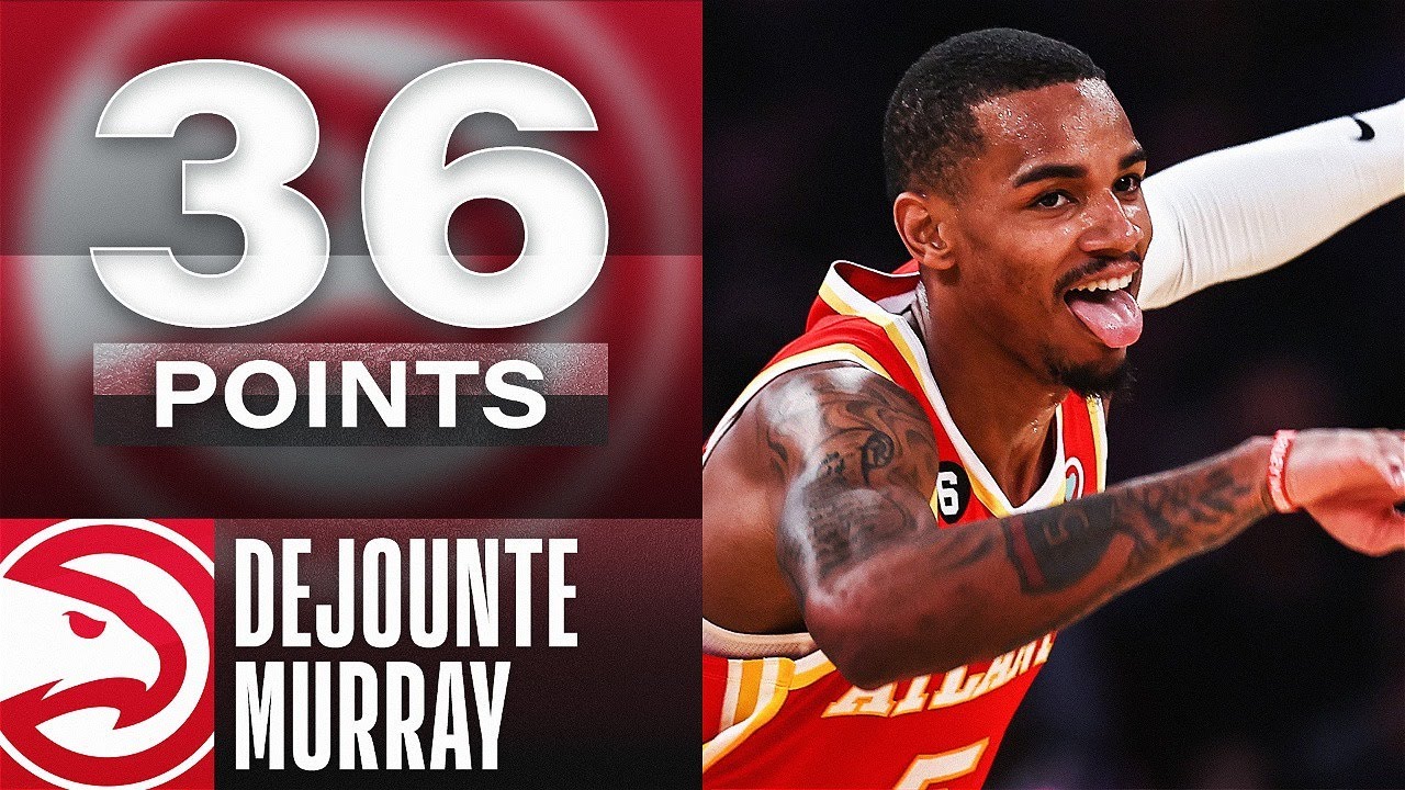 LAL (32-21) 04h00En effet, dans la victoire des Hawks sur les Knicks 112 à 99, Dejounte Murray inscrit 36 points (record de points en carrière) à 14/27 aux tirs dont 5/12 à trois points, 3/3 aux lancers francs, 9 passes décisives, 5 interceptions et 4 rebonds en 38 minutes de temps de jeu. En l'absence de Trae Young blessé à la mi-temps, Murray a parfaitement secondé le gunner. Pour les Knicks, Julius Randle marque 14 points, Evan Fournier passe à côté avec 3 points à 1/6.