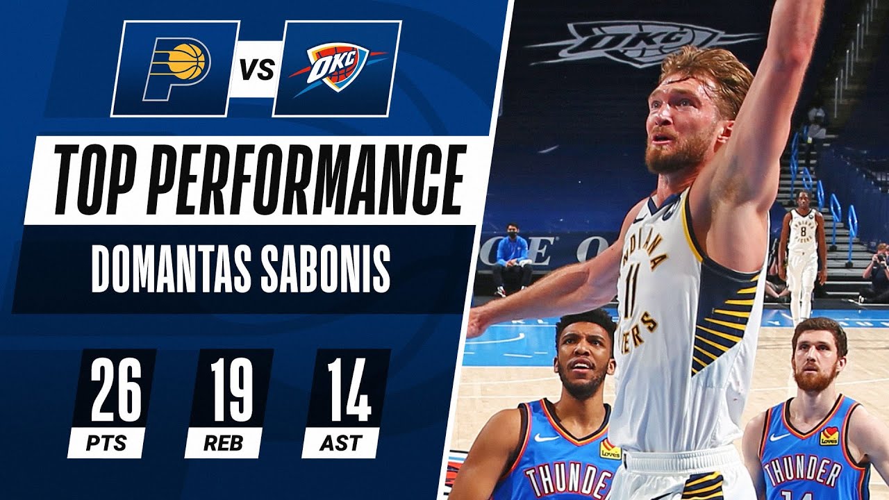 Auteur d'un triple double, Domantas Sabonis termine avec 26 points à 10/13 aux tirs dont 2/3 à trois points, 4/6 aux lancers francs, 19 rebonds et 14 passes décisives en 30 minutes de temps de jeu seulement. Indiana s'impose de 57 points (!) 152 à 95 face au Thunder complètement dépassé.