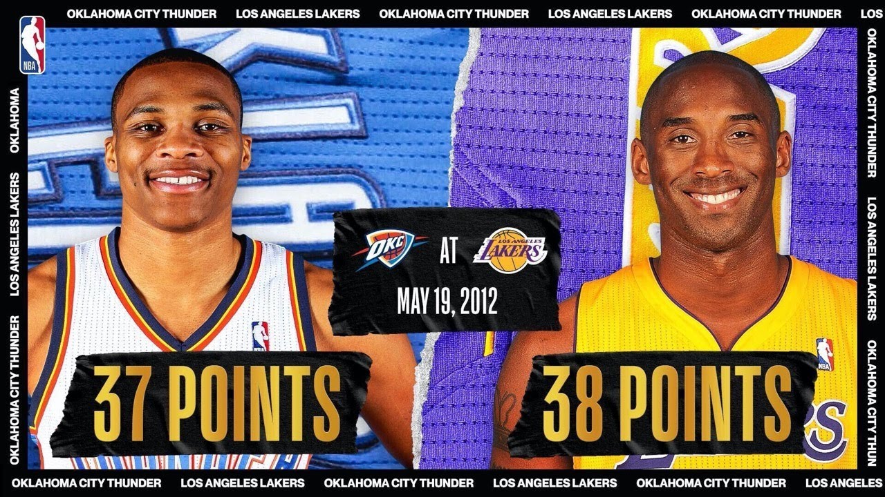 NOP02h00Le 19 Mai 2012, le Thunder d'Oklahoma City se rendait au Staples Center pour affronter les Lakers de Los Angeles. L'occasion d'apprécier un duel de toute beauté entre Russell Westbrook (37 points) et Kobe Bryant (38). Attention tout de même, car si le focus est bien ciblé sur Brodie et le Black Mamba, le salut proviendra de Kevin Durant !