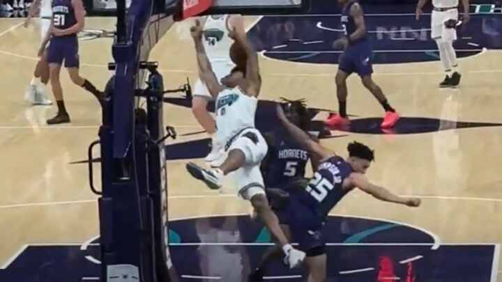 POR 136 (10-16) A une minute de fin de la première mi-temps, Jaylen Wells s'en va tranquillement poser un dunk, mais il est poussé dans le dos par le joueur des Hornets, KJ Simpson. Une faute vilaine et stupide qui déséquilibre le rookie de Memphis dans les airs. La chute sur le parquet est terrible, Wells tombant sur le dos en se cognant la tête. Resté un long moment sans bouger, il est finalement évacué sur une civière, occasionnant une interruption de 20 minutes. Après une vérification vidéo du corps arbitral, le meneur de Charlotte KJ Simpson a été sanctionné d'une faute flagrante de niveau 2, entraînant immédiatement son expulsion. Transporté à l'hôpital, Wells souffre d'une fracture du poignet droit et va continuer à recevoir des soins. Présent sur les lieux, son père Fred Wells a donné des nouvelles via les réseaux sociaux :