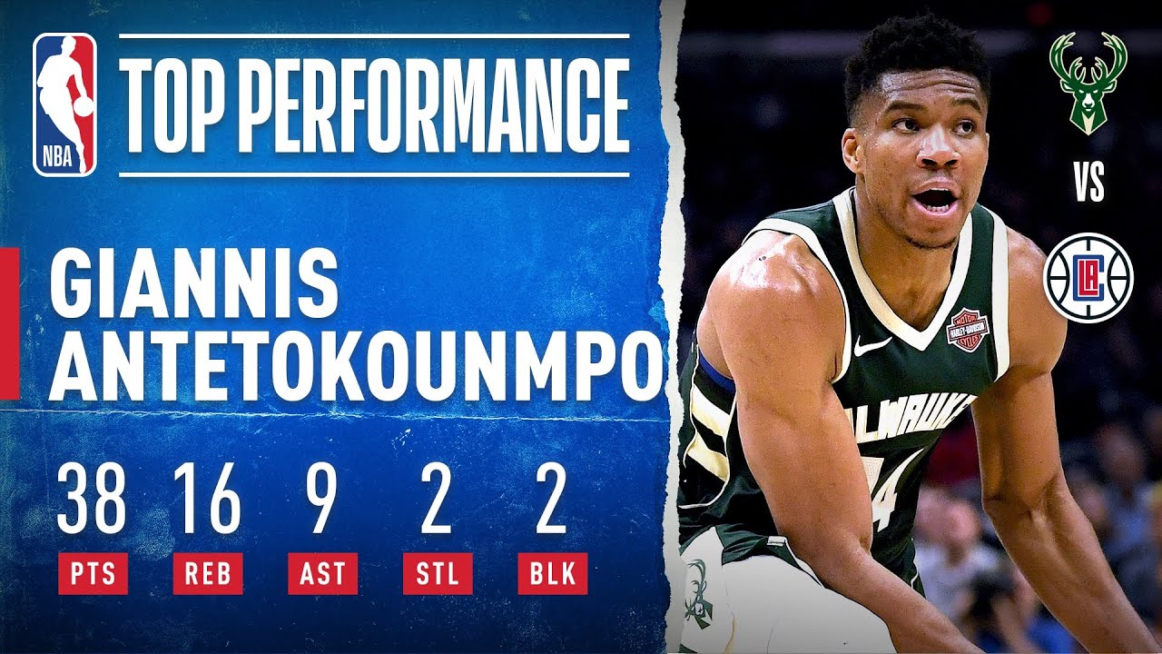 NOP 116Dans la victoire des Bucks face aux Clippers 129 à 124, Giannis Antetokounmpo inscrit 38 points à 10/21 aux tirs dont 4/7 à trois points, 14/18 aux lancers francs, 16 rebonds, 9 passes décisives, 2 interceptions et 2 contres en 36 minutes de temps de jeu.