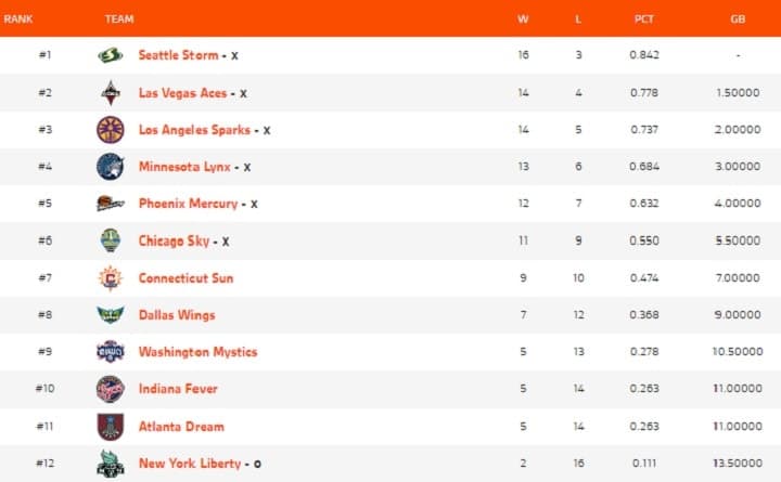 Reste un trio en tête du classement pour deux places. Vu qu’il n’y aura pas d’avantage du terrain cette saison, être premier ou deuxième a certes moins d’intérêt que les années précédentes mais le Storm aimerait quand même garder sa première place qu’elle a obtenu dès les premiers jours de saison régulière. Et pour cause, une première place leur permettrait d’éviter un éventuel affrontement avant les finales face aux Aces ou aux Sparks. En effet, Las Vegas et Los Angeles ne lâchent rien et se livrent une belle bataille pour arracher la deuxième place ce qui force Seattle à ne pas baisser de régime sous peine de voir revenir très vite les deux équipes qui sont actuellement dans le rétroviseur. Ca tombe bien, les Aces vont affronter successivement le Storm et les Sparks ! Une rude dernière semaine donc pour les joueuses de Bill Laimbeer, mais qui ont donc l’avantage d’avoir leur destin entre les mains. Enfin presque, puisqu’il faudrait quand même que le Storm perde un autre match pour se faire chiper la première place. Seulement deux victoires séparent le Storm, premier, des Sparks, troisièmes.