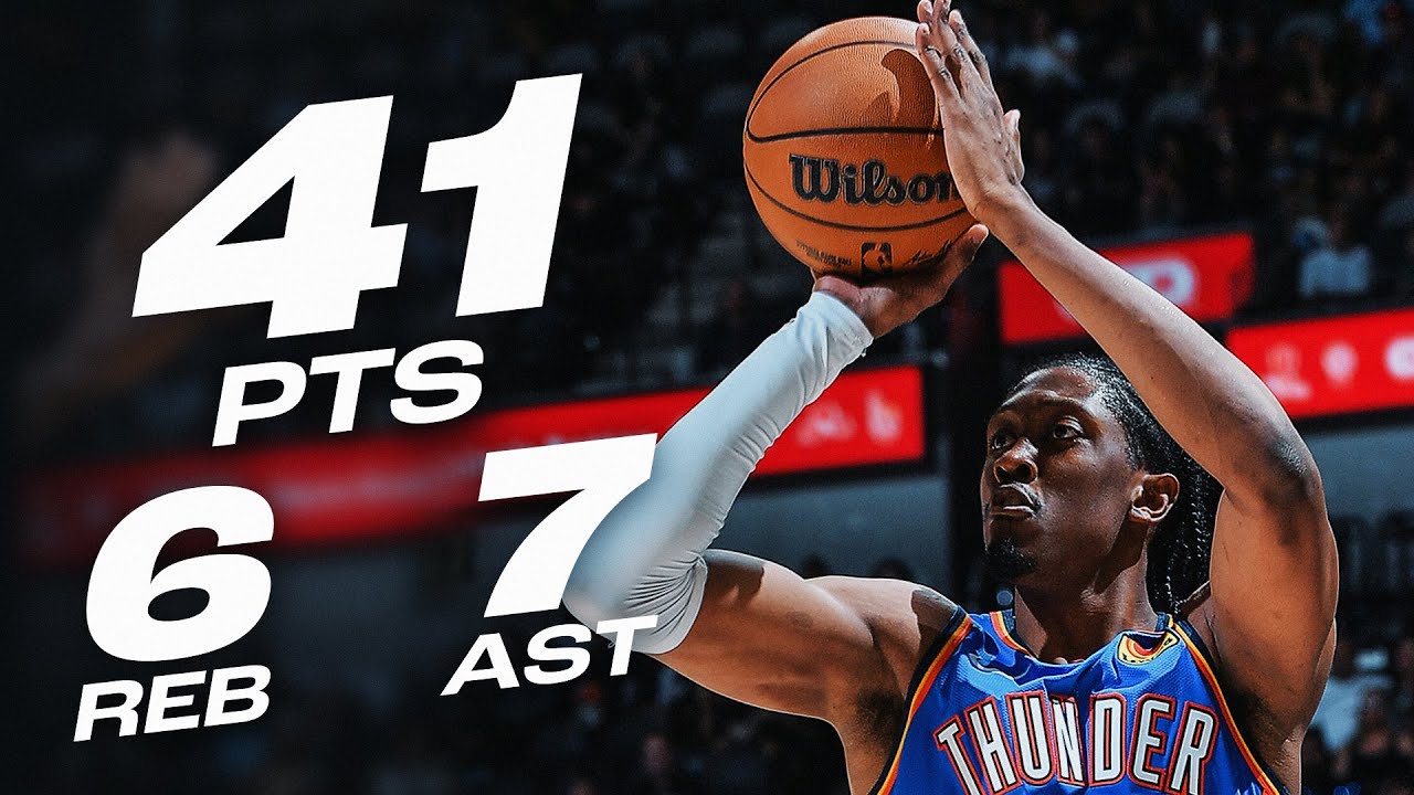 NOP 116Dans la victoire du Thunder sur les Spurs 146 à 132 au Frost Bank Center, Jalen Williams réalise son record de points en carrière avec 41 unités au compteur à 15/24 aux tirs dont 4/8 à trois points, 7/7 aux lancers francs, 7 passes décisives et 6 rebonds en 33 minutes de temps de jeu. Shai Gilgeous-Alexander ajoute 31 points et 8 passes.