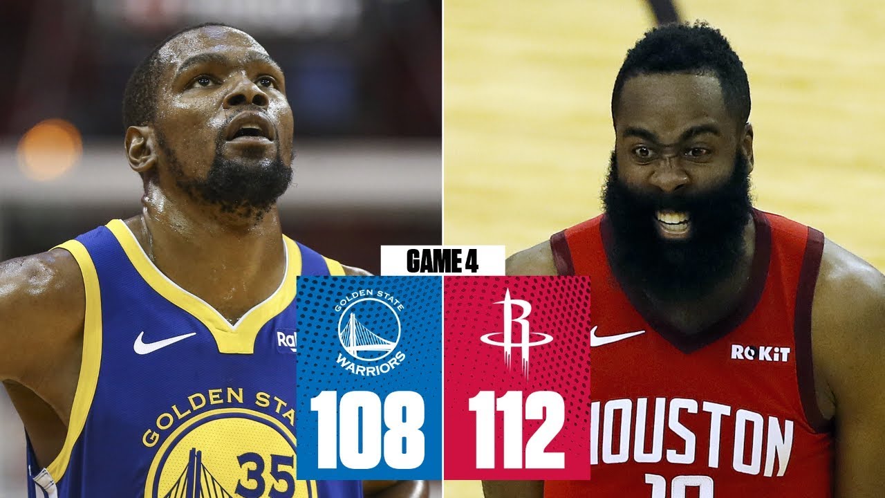 LAC 115 (27-28) Malgré 64 points du duo Kevin Durant (34) et Stephen Curry (30), ce sont bien les Rockets de James Harden qui s'imposent 112 à 108 dans ce Game 4. The Beard marque 38 points à 13/29 aux tirs dont 6/17 à trois points, 6/8 aux lancers francs, 10 rebonds et 4 passes décisives. On relève 17/50 à trois points pour la franchise texane tandis que Golden State tente sa chance à 33 reprises pour 8 tirs primés. Un arc-en-ciel de tir à trois points même si on sent bien que les deux équipes survivent grâce à leur réussite dans cet exercice.