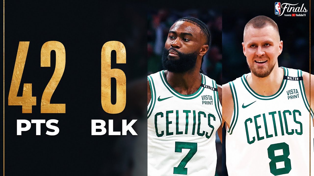 NOP02h00Dans le Game 1 des NBA Finals, les Celtics dominent les Mavericks 107 à 89 avec 42 points cumulés pour Jaylen Brown et Kristaps Porzingis. Ce dernier est d'ailleurs le héros du Game 1 puisqu'il revenait de blessure et domine déjà les débats. Brown termine à 22 points à 7/12 dont 2/6 à trois points, 6/11 aux lancers francs, 6 rebonds, 3 interceptions et 3 contres en 37 minutes de temps de jeu tandis que Porzingis ajoute 20 points à 8/13 dont 2/4 derrière l'arc et 6 rebonds en sortie de banc pour 21 minutes seulement. Jayson Tatum score 16 points, 11 rebonds et 5 passes.