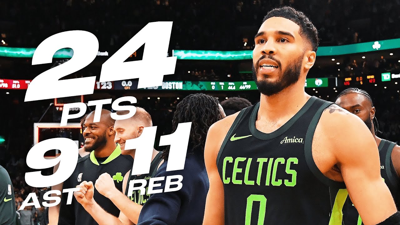 Tatum termine à 24 points dont 5/12 à trois points, 11 rebonds et 9 passes décisives.