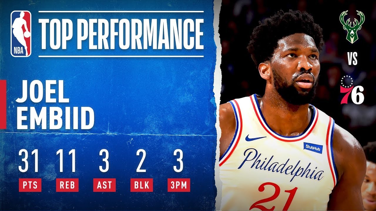 Avec 31 points à 11/21 aux tirs dont 3/6 à trois points, 6/6 aux lancers francs, 11 rebonds et 3 passes décisives en 28 minutes de temps de jeu, Joel Embiid a parfaitement répondu aux attentes face à Milwaukee. Giannis Antetokounmpo termine avec 18 points, 14 rebonds et 7 passes mais The Greek Freak ne fait pas preuve d'adresse avec 8/27.