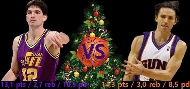 Résultats : 2-1 pour Stockton. Son jeu est moins flashy, va plus droit au but et au final aura été plus efficace avec deux finales NBA perdues contre sa Majesté. C'est surtout pour sa technique défensive que Stock prend le dessus sur Nash... qui perd donc deux round à cause de sa défense passoire.