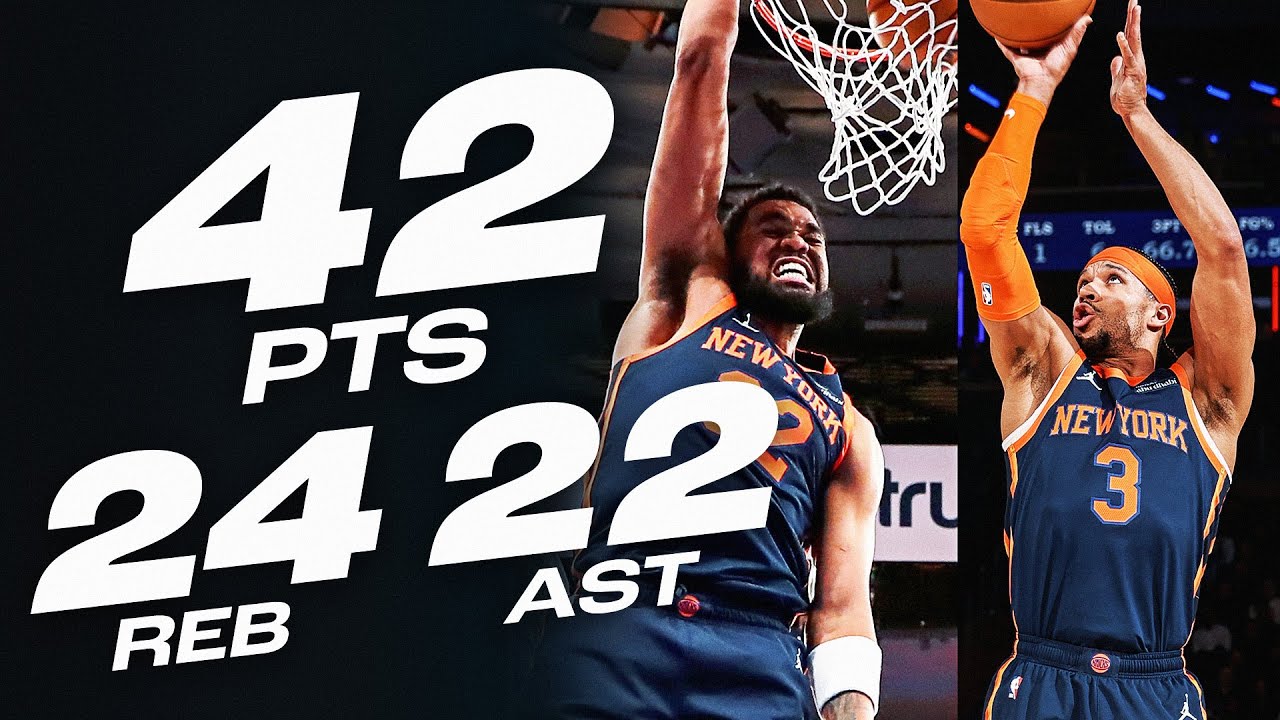 NOP02h00Dans la victoire des Knicks sur les Mavericks 128 à 113, Karl-Anthony Towns et Josh Hart totalisent 42 points, 24 rebonds et 22 passes décisives, de quoi faire craquer la franchise texane. Individuellement KAT est en triple double avec 26 points, 12 rebonds et 11 passes décisives tandis que Hart fait de même avec 16-12-11. Le dernier triple double de Towns remontait à plus de 3 ans. OG Anunoby se charge de la marque avec 35 points.