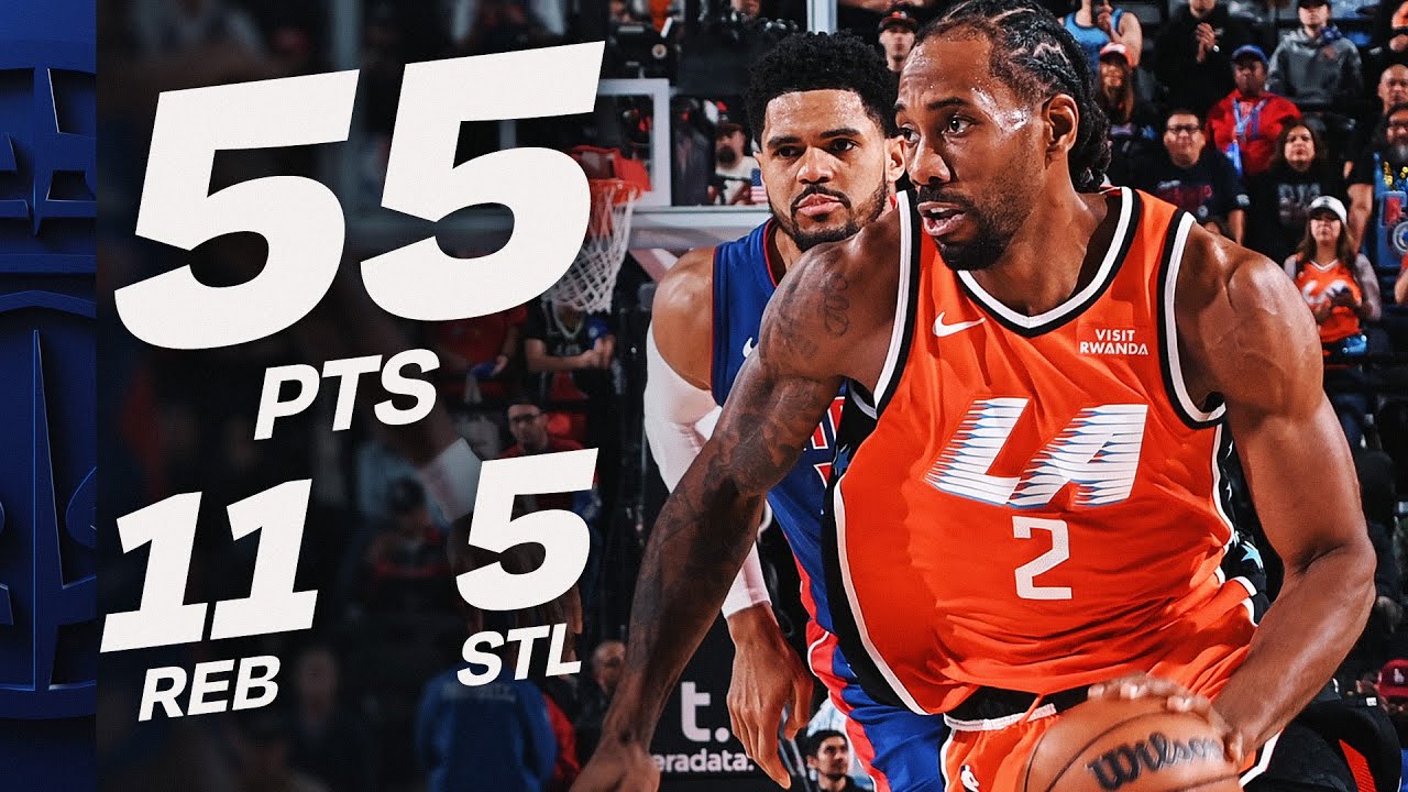 Kawhi Leonard a inscrit 55 points, un record en carrière, pour conduire les Los Angeles Clippers à une victoire 112-99 face aux Detroit Pistons, leaders de la conférence Est. Avec cette prestation, Leonard égale le record de la franchise pour le nombre de points marqués dans un match, détenu également par James Harden.