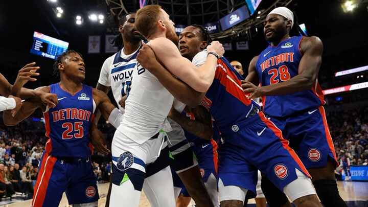 LAC (6-19) 04h30Lors de la victoire des Timberwolves sur les Pistons, ce dimanche, une bagarre a éclaté au milieu du deuxième quart-temps. Sur un drive de Naz Reid, le rookie de Detroit Ron Holland a tenté de lui subtiliser le ballon, mais a écopé d'une faute. Un geste qui n'a pas plu à Reid, qui s'est en immédiatement pris verbalement à Holland, en le pointant du doigt à plusieurs reprises. Le début des hostilités ! Dans la foulée, Donte DiVincenzo a bousculé le pivot des Timberwolves, ce qui a donné lieu à une mêlée entre les deux équipes. Puis, deux Pistons se sont ajoutés à la rixe, Marcus Sasser et Isaiah Stewart. Les arbitres ont expulsé les cinq joueurs en question, mais aussi l'entraîneur de Detroit, JB Bickerstaff et l'adjoint de Minnesota, Pablo Prigioni.