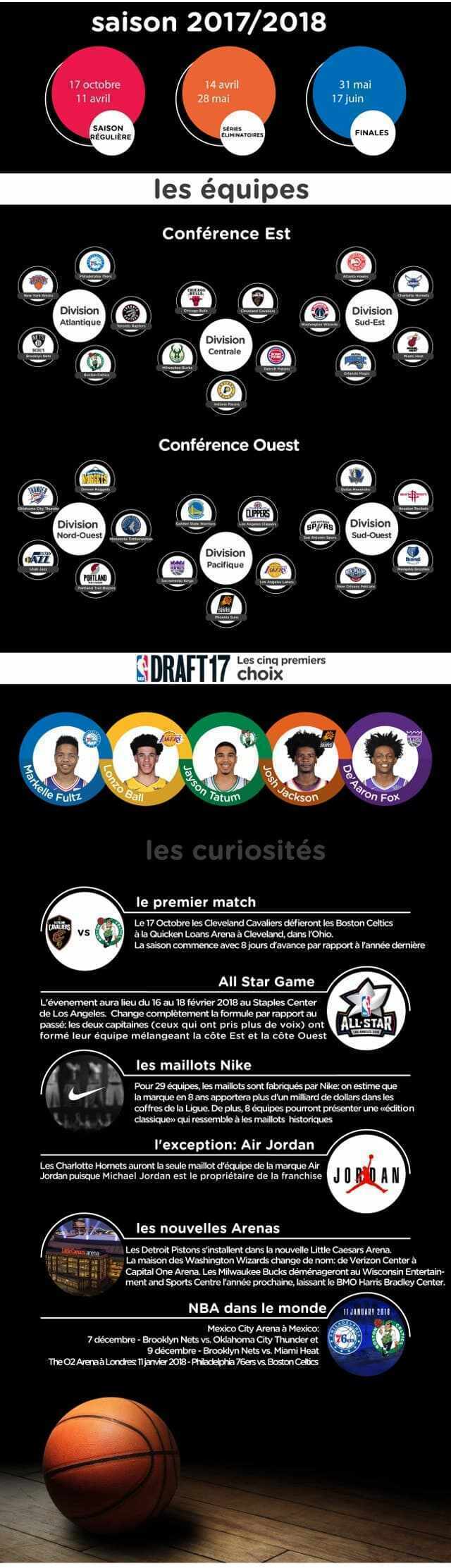 Pour la rentrée NBA qui aura lieu dans la nuit de Mardi à Mercredi prochain, nous vous proposons une infographie de l'imprimeur en ligne Stampaprint qui recense les dates, les nouveautés et les faits saillants de la saison 2017-18.