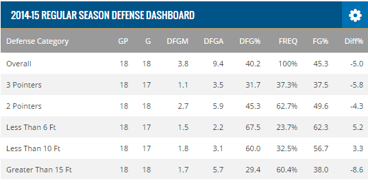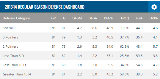 Pour clarifier ce tableau, DFGM signifie le nombre de paniers inscrits par son vis-à-vis, DFGA étant le nombre de tirs tentés et DFG le pourcentage de réussite. Quant à FG, cela représente le pourcentage habituel de son vis-à-vis. Pour résumer la défense "Casper" de McLemore, il suffit de voir qu'en 2013-2014 ses adversaires voyaient leur réussite augmenter face à lui, partout sur le terrain ! À trois points, dans la raquette, à mi-distance... C'était journées portes ouvertes !