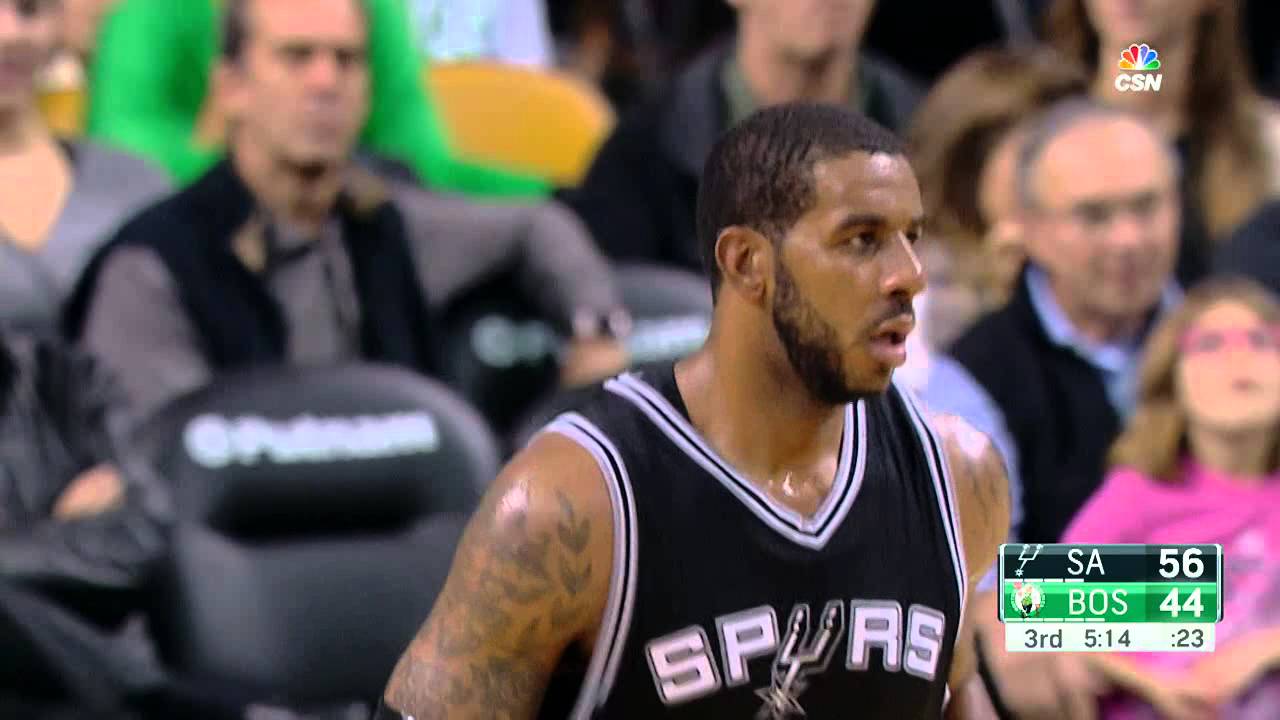 POR (9-16) 03h0024 points à 8/18, 14 rebonds et 5 passes décisives pour LaMarcus Aldridge face à Boston. Voici un match référence pour l’intérieur star de San Antonio. Il permet ainsi à San Antonio d’empocher une seconde victoire en trois rencontres. Un match référence pour Aldridge qui a connu deux matchs timides en attaque en ce début de saison. L'adaptation aux systèmes de jeu des Spurs n'y est sans aucun doute pas anodin.