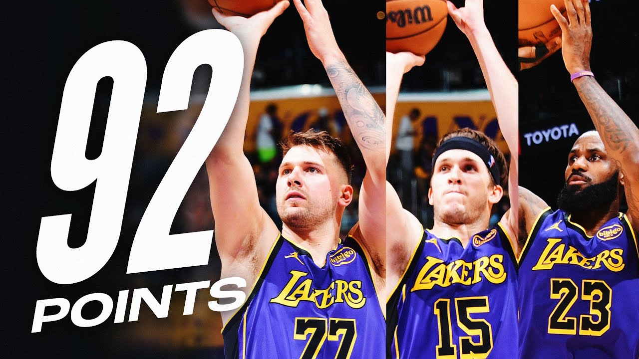 NOP02h00Dans la victoire des Lakers sur les Pelicans 124 à 108, Luka Doncic, Austin Reaves et LeBron James totalisent 92 points ! Individuellement, le Slovène est à 35 points à 10/21 aux tirs dont 4/10 à trois points, un parfait 11/11 aux lancers francs, 6 rebonds et 6 passes décisives en 36 minutes de temps de jeu. Austin Reaves ajoute 30 points à 8/13 dont 6/9 derrière l'arc, 8/9 aux LF et 7 passes en 36 minutes. Enfin, le King est à 27 points à 9/17 dont 2/7 à trois points, 7/8 aux LF et 8 passes en 33 minutes.