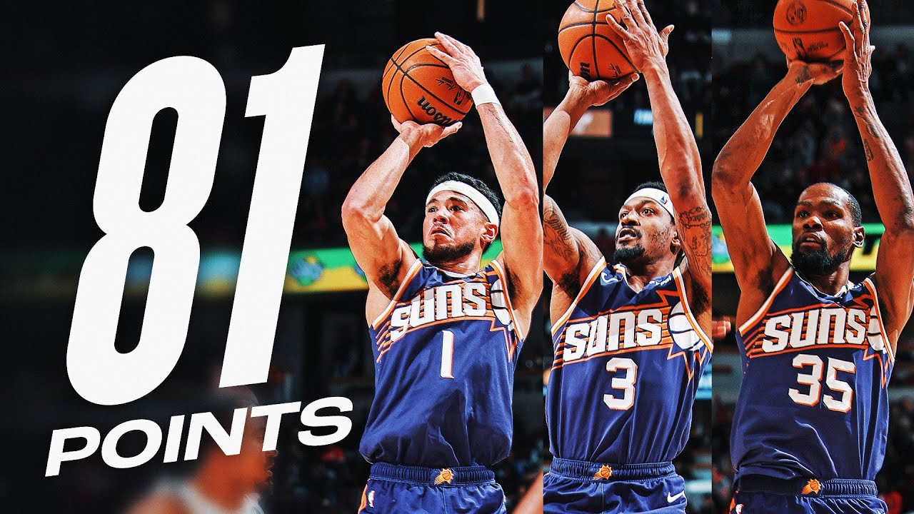 NOP 116Dans la victoire des Suns sur les Bills 121 à 117, Devin Booker, Kevin Durant et Bradley Beal totalisent 81 points. Indviduellement, Booker est à 29 points et 8 passes décisives, KD à 27 points, 10 rebonds et 5 passes et Beal à 25 points et 6 rebonds.