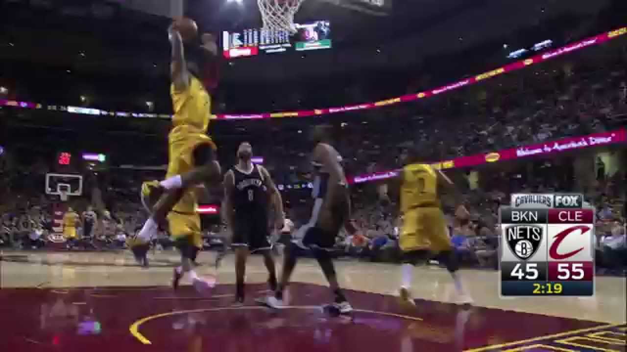 En 3, bel effort collectif des Cavaliers avec Kevin Love pour la relance pour Kyrie Irving qui sert LeBron James pour le slam.