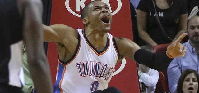 19 points, 8 passes, 8 rebonds, 4 interceptions pour Kevin Durant lors de la victoire du thunder sur le parquet du Heat cette nuit. Le MVP en titre permet à son équipe d'enfin retrouver un bilan positif (21V-20D) et de se rapprocher de la 8ème place qualificative en playoffs. Il affiche une performance tout aussi importante que celle de Russell Westbrook, qui termine avec 19 points, 10 rebonds, 6 passes et 4 interceptions, mais se troue derrière l'arc avec un horrible 0/8. La victoire a été aussi déterminée par le bon match de Reggie Jackson (16 points à 7/9), même si Dion Waiters est lui passé à côté (1/9 aux tirs, 3 points). Du côté floridien, rien ne fontionnait comme prévu. 8 pertes de balles dans le 1er quart temps (19 au final!), une défense qui peine, des rotations douteuses et la sortie sur blessure du meilleur joueur jusque là, le surprenant Hassan Whiteside, qui avait compilé 10 points à 5/5 aux tirs et 2 rebonds durant le 1er quart temps. Par la suite, Chris Bosh (16 points, 7 rebonds) et Dwyane Wade (18 points, 6 passes) ont tout tenté mais ça ne suit pas derrière (aucun autre joueur en double figure) et le Heat s'incline donc à domicile face au Thunder, et déjà pour la 23ème fois de la saison.
