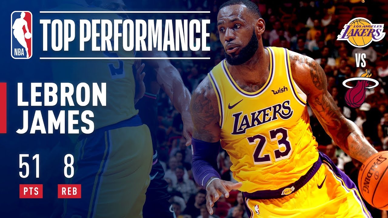 NYK (35-21) 02h30Il s'agit du 13ème match en carrière à plus de 50 points pour LeBron James. Dans la victoire des Lakers en Floride à Miami 113 à 97, James porte les jeunes Lakers sur ses épaules. Résultat ? Un carton plein avec 51 points à 19/31 aux tirs dont 6/8 à trois points, 7/10 aux lancers francs, 8 rebonds, 3 passes décisives et 2 interceptions en 38 minutes de temps de jeu. La tournée des anciennes équipes de James commence bien... sachant que Los Angeles va se déplacer sur son prochain match à Cleveland.