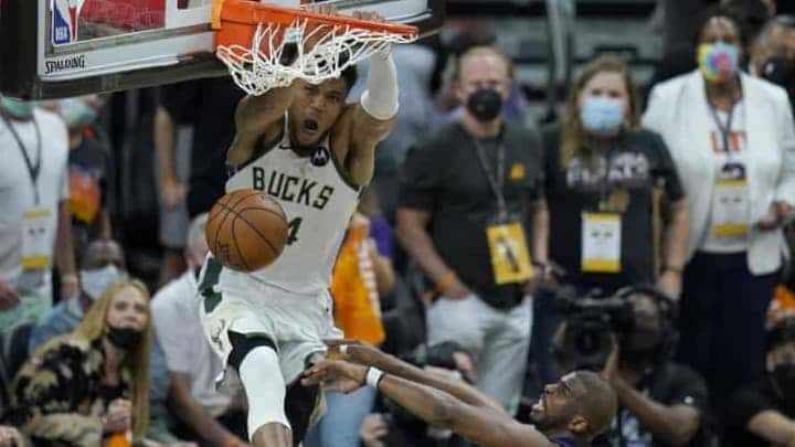 C'est presque fait pour les Bucks, qui parviennent à remporter ce match 5 à Phoenix et ne sont donc plus qu'à une victoire du titre. Pourtant, les Suns sont clairement pris le meilleur départ. Toute l'équipe est intenable aux tirs (13/19 sur les 12 premières minutes) et Chris Paul parvient à faire prendre deux fautes très rapidement à Jrue Holiday. Le meneur sort, ce qui laisse les mains libres au Point God pour organiser le jeu. Du coup, les Suns prennent rapidement une quinzaine de points d'avance, et commencent le deuxième quart avec cet écart. Sauf que cette fois encore, les Bucks ne paniquent pas. Jrue Holiday est de retour, et il n'est pas content. Sur le deuxième quart, le meneur inscrit ainsi 14 points à 6/7 aux tirs, et délivre 5 passes décisives, sans perdre un ballon. Comme en face toute l'équipe a perdu son adresse (10/28 aux tirs sur le quart-temps), les Bucks reviennent dans la rencontre, et passent même devant à la pause (64 à 61) grâce à un Jrue Holiday en mode patron (18 points et 7 passes), bien secondé par Giannis Antetokounmpo (5/8 aux tirs, pour 12 points, 4 rebonds et 4 passes). En face, Devin Booker (15 points) et Chris Paul (9 points, 6 passes, 0 perte de balle) sont bien performés et aidés par Deandre Ayton (12 points et 4 rebonds) et Crowder (10 points). Mais le troisième quart va sonner le glas des espoirs des Suns dans ce match. Khris Middleton, pas très bon jusque-là, se réveille (11 points à 5/7 dans le troisième quart) et Jrue Holiday ne ralentit pas. Le duo permet aux Bucks d'accentuer leur avance, alors qu'en face Devin Booker récupère tous les tirs en isolation. Ça marche individuellement pour l'arrière (14 points à 6/11), mais le collectif des Suns accuse le coup, ce qui permet aux Bucks d'accentuer leur avance (+ 10, 12 minutes à jouer). Sauf que ces Suns ont du cœur, et parviennent à revenir à un petit point dans la dernière minute. C'est le moment que choisit Jrue Holiday (27 points, 13 passes et 3 interceptions) pour mettre un point d'orgue sur son énorme match en interceptant le ballon dans les mains de Devin Booker alors qu'il reste 17 secondes à jouer, et en envoyant Antetokounmpo au alley-oop. Paul fait faute, et le Grec ne tremble pas sur la ligne des lancers pour donner 4 points d'avance aux Bucks, qui vont garder leur avance au petit jeu des lancers francs. Les Bucks peuvent dire merci à leur Big Three (32 points à 14/23, 9 rebonds et 6 passes pour Giannis, 29 points à 12/23, 7 rebonds et 5 passes pour Middleton et 27 points et 13 passes pour Holiday), qui ont pris le dessus sur celui des Suns (21 points et 11 passes pour Paul, 40 points à 17/33 pour Booker, 20 points et 10 rebonds pour Ayton).
