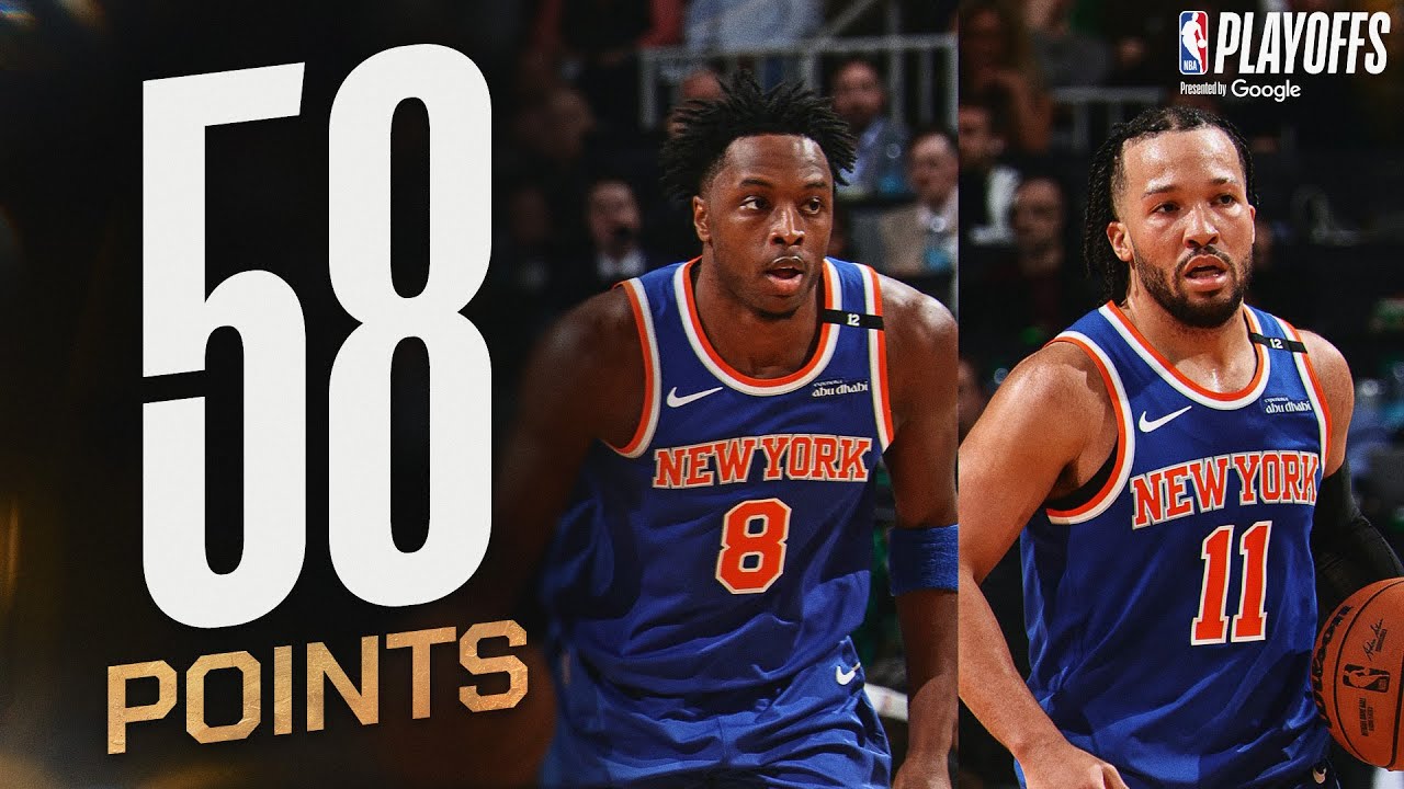 NOP02h00Dans la victoire des Knicks face aux Celtics 108 à 105 dans le Game 1 de la série à Boston, Jalen Brunson et OG Anunoby totalisent 58 points, 29 points chacun. On relève aussi 14 points et 13 rebonds de Karl-Anthony Towns et un ballon volé crucial de Mikal Bridges (8-7-6) sur Jaylen Brown pour l'emporter en OT.