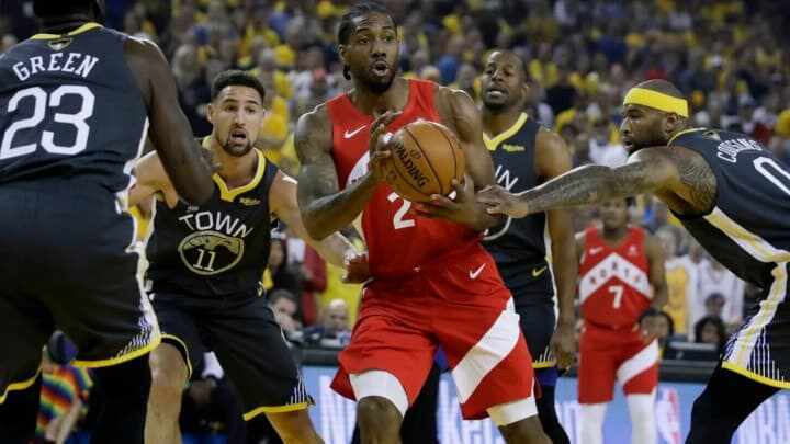 Malgré l'ignoble début de match de DeMarcus Cousins, auteur de trois pertes de balle en deux minutes, les Warriors sont meilleurs pour lancer leur rencontre. La défense est au niveau des deux côtés mais Klay Thompson est impressionnant à la passe et trouve des solutio,s pour Draymond Green et DeMarcus Cousins. De l'autre côté, c'est Kawhi Leonard qui porte les siens avec 7 des 10 premiers points de Toronto, puis 14 sur les 17 premiers à la fin du premier quart, qui voit les Warriors mener de 6 points (23 à 17). Comme Leonard n'est pas sur le terrain et que Danny Green n'est clairement pas dans un bon soir (0/6 aux tirs pour commencer le match), on se dit que c'est le moment pour les Warriors de prendre de l'avance. Malheureusement pour eux ils n'y parviennent pas et quand l'ancien ailier des Spurs retournent en jeu, les champions en titre n'ont plus que quatre points d'avance (31 à 27, 7 minutes restantes dans le dernier quart). Thompson, décidemment pas tant gêné que ça par sa blessure, continue d'être efficace et marque cinq points d'affilée pour redonner un peu d'air aux Warriors. Il est bien soutenu par Kevon Looney (8 points à 4/5) et Draymond Green (6 points, 7 rebonds et 6 passes) mais, bizarrement alors que l'impression visuelle donne des Warriors complétement dominants, les Raptors ne sont qu'à 4 petits points à la mi-temps (46 à 42). La faute notamment au très mauvais match de Stephen Curry (8 points, 3 rebonds et 2 passes à 0/5 à trois points) et aux trop nombreuses pertes de balle (9 à la mi-temps, contre 4 pour Toronto). Du côté des Raptors, Leonard s'est un peu calmé et est toujours à 14 points mais il a trouvé des relais intéressants, avec notamment Serge Ibaka en sortie de banc (8 points à 4/5 et 2 rebonds).