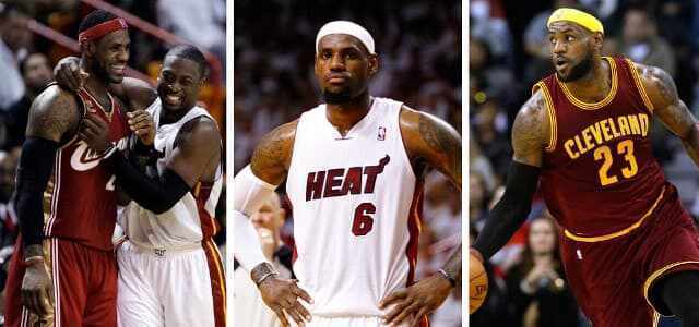 "The Decision" qui a tant fait couler d'encre. Lorsque le joueur d'Akron rejoint le Heat de l'insatiable Pat Riley en 2010, les 4 années qui vont suivre vont certes lui permettre de remporter deux titres NBA mais James n'est plus seul. Les All Stars Dwyane Wade et Chris Bosh forment le Big Three de terreur de la NBA. Une situation qui lui permet de redescendre en dessous des 40 minutes par match, environ 39, pour une moyenne de points légèrement en baisse, 28 points.