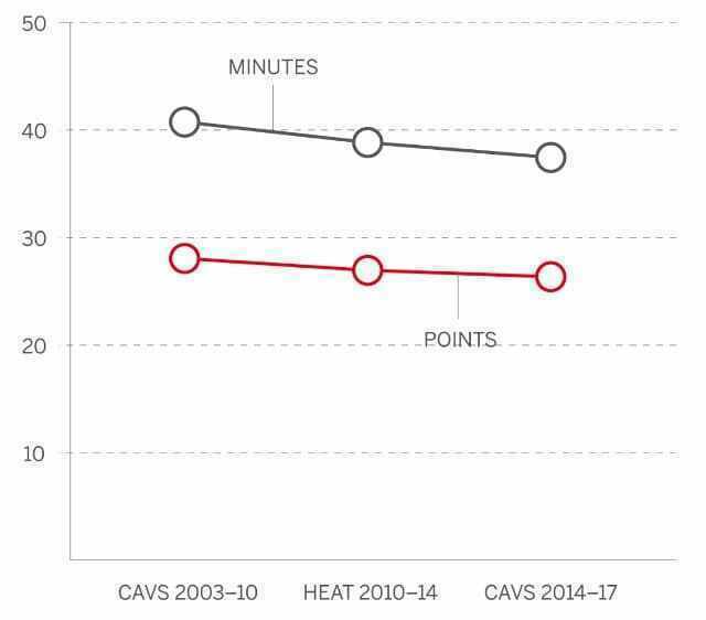 On relève que James tournait à 7 passes décisives lors de ses 7 années avec les Cavaliers, 6,5 avec le Heat de Miami puis 7,7 depuis 2014. On explique juste la baisse avec le Heat liée au fait que Wade et Bosh savaient créer leur propre espace et shoot. Le King se préserve, joue avec plus d'altruisme et d'éfficacité qu'au début de sa carrière et implique davantage ses coéquipiers. Une évolution logique dans le jeu d'une superstar NBA. Cette saison, James tourne même à 8,7 passes par match.