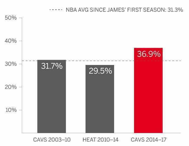 James n'était pas un shooteur à trois points d'un grand standing au début de sa carrière. Mais les années ont fait changer le style de jeu du kid d'Akron. Lors des 5 dernières minutes dans le money time ou en prolongation, une évolution se confirme avec un pourcentage à trois points qui passe de 31,7% lors de ses 7 premières années à 36,9% depuis 2014. Le saviez-vous, un pourcentage plus élevé dans les moments clutch que le gunner des Warriors de Golden State, Stephen Curry, qui carracole à 34,8% sur les trois dernières saisons.