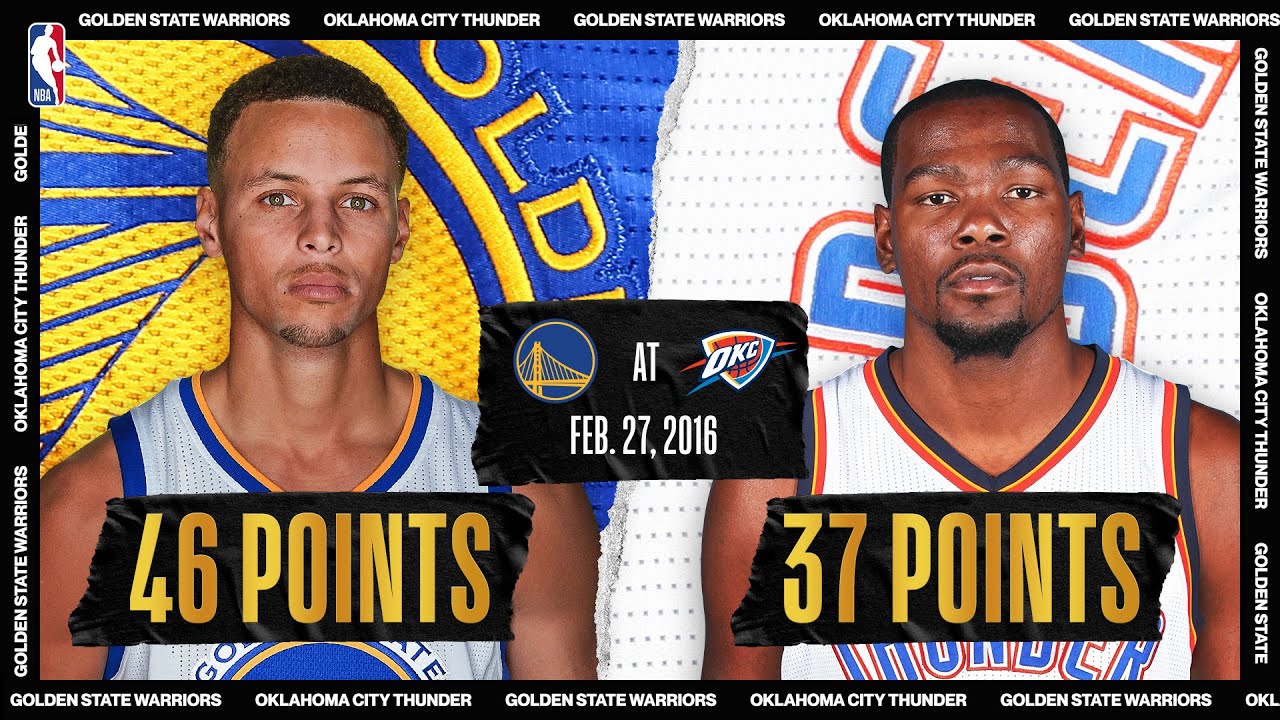 Dans cette rencontre du 27 Février 2016, Stephen Curry prend feu avec 12 paniers à trois points et le Game Winner face à Oklahoma City. Pour le Thunder, Russell Westbrook et Kevin Durant formaient un duo performant. Une rencontre execeptionnelle à suivre dans son intégralité, diffusion de 2h02.