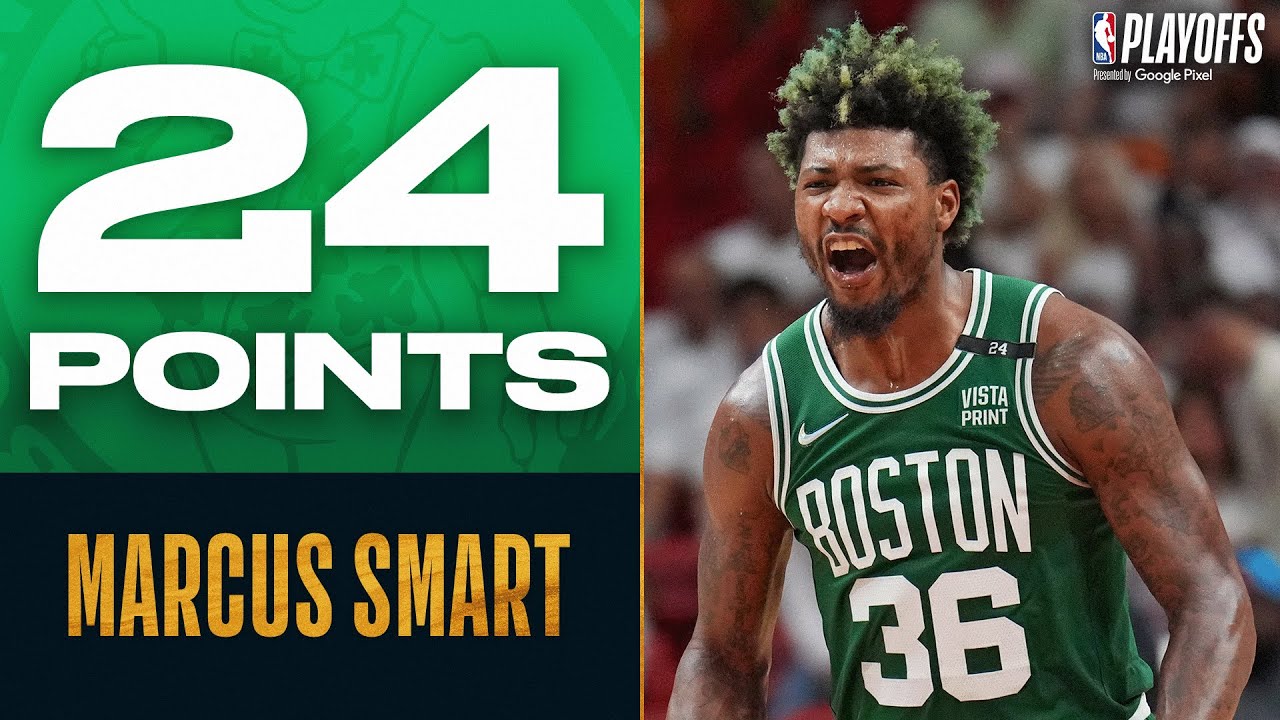 NOP02h00En 40 minutes de temps de jeu, Marcus Smart filrte avec le triple double, 24 points à 8/22 aux tirs dont 5/12 à trois points, 3/3 aux lancers francs, 12 passes décisives (record personnel en playoffs) et 9 rebonds. Jayson Tatum ajoute 27 points et Jaylen Brown 24. Pour le Heat, Jimmy Butler surnage avec 29 points mais l'arrière a été clairement esseulé.