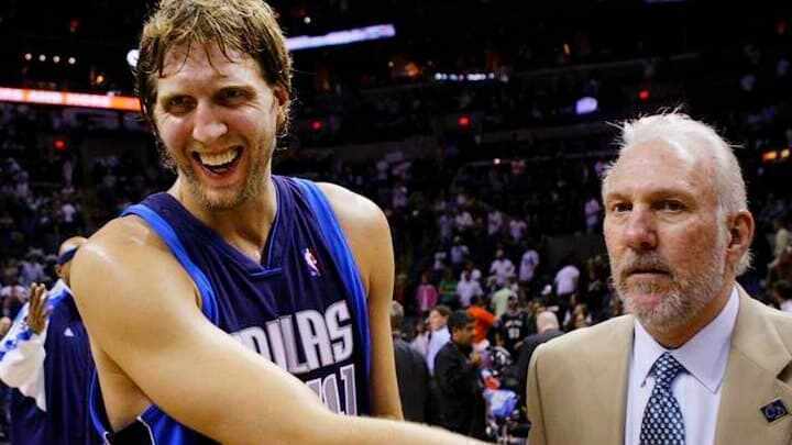 En saison régulière, le Wunderkind a croisé le fer à 77 reprises contre les Spurs, l'équipe qu'il a le plus joué dans sa carrière. Avec 19.1 points, 8.0 rebonds et 2.4 passes de moyenne face aux éperons, Nowitzki a mené la vie dure à Coach Pop. Mais, c'est surtout lors des playoffs que ces joutes prenaient de la hauteur. Les Texans se sont affrontés à six reprises entre 2001 et 2014 avec quatre séries remportées par San Antonio. Tant de souvenirs jalonnent ces duels, du match 7 épique en 2006 gagné par Dirk en overtime jusqu'à ses 35 points lors du match 5 en 2009 pour envoyer les Spurs en vacances. La légende des Mavs a, elle aussi, eu quelques mots pour son adversaire du banc d'en face :
