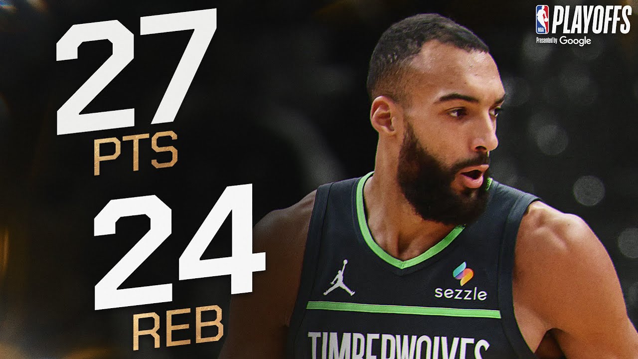 NOP02h00Dans la victoire des Timberwolves 103 à 96 face aux Lakers, Rudy Gobert complète un solide double double, 27 points à 12/15 aux tirs, 3/6 aux lancers francs et la bagatelle de 24 rebonds (record en carrière en playoffs) en 39 minutes de temps de jeu. Julius Randle ajoute 23 points, 15 points, 11 rebonds et 8 passes décisives d'Anthony Edwards.