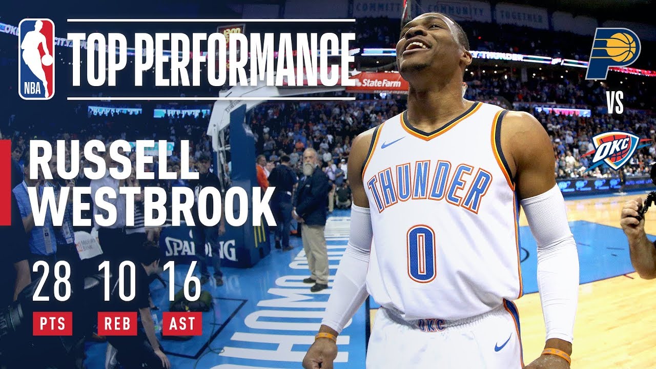 POR 136 (10-16) Dans la victoire du Thunder 114 à 96 face aux Pacers, Russell Westbrook signe son second triple double de la saison (81ème en carrière), 28 points à 10/18 aux tirs, 16 passes décisives, 10 rebonds et 7 ballons perdus. Des passes qui profitent également à Carmelo Anthony qui inscrit également 28 points à 9/17, 3/7 derrière l'arc, 10 rebonds, 3 contres et 6 ballons perdus. Paul George n'aura joué que 19 minutes face à son ancienne équipe, fouled out, pour 10 points.