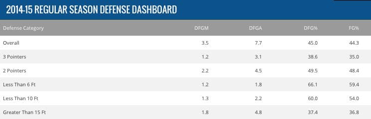 Ses adversaires gonflent constamment leurs stats au scoring. Le 11 mars dernier, Chris Paul (Clippers) inscrivait 33 à 11/19 au tir ; le 4 mars, Isaiah Canaan (Sixers) réalisait le match de sa vie grâce à RW en plantant 31 points à 10/16 au shoot ; le 23 décembre, Damian Lillard (Blazers) compilait 40 points à 8/12 longue distance et 11 passes décisives. Pour clarifier ces propos, voici un tableau disponible sur nba.com. DFGM représente le nombre de paniers inscrits par son vis-à-vis lorsqu'il conteste ses tirs, DFGA étant le nombre de tirs tentés et DFG le pourcentage de réussite. Quant à FG, cela indique le pourcentage habituel de l'attaquant qu'il défend.
