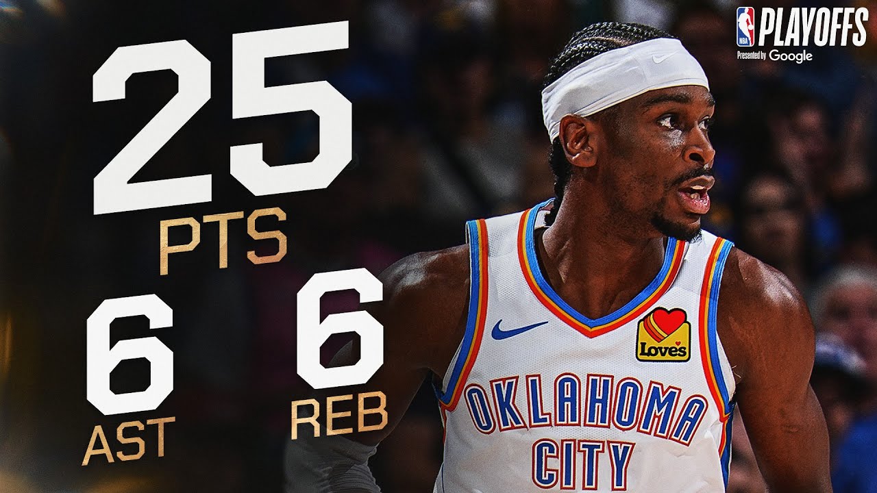 NOP 116Dans la victoire du Thunder 92 à 87 face aux Nuggets dans le Game 4 de la série, Shai Gilgeous-Alexander signe 25 points à 8/19 aux tirs, 0/5 à trois points, 9/12 aux lancers francs, 6 rebonds, 6 passes décisives et 2 interceptions en 38 minutes de temps de jeu. Le potentiel MVP de la saison régulière est bien soutenu par le quatuor Jalen Williams, Alex Caruso, Aaron Wiggins et Cason Wallace qui oscillent tous entre 10 et 11 points.