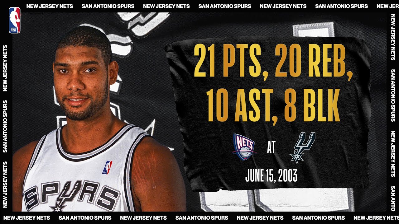 NOP02h00Le 15 Juin 2003, Tim Duncan (21 points, 20 rebonds, 10 passes décisives et 8 contres) frôle le quadruple double mais permet surtout à San Antonio de remporter un titre NBA. Les Spurs remportent la série 4 à 2 face aux Nets.