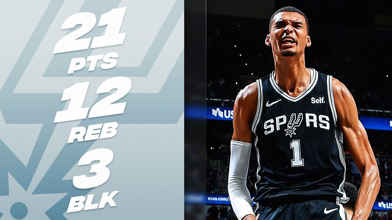POR (25-28) 04h00Dans la victoire des Spurs sur les Rockets en prolongation 126 à 122, Victor Wembanyama termine à 21 points, 12 rebonds, 3 contres et 2 interceptions en 31 minutes de temps de jeu. Néanmoins, derrière les stats de Wemby, l'adresse n'a pas été au rendez-vous avec 7/19 aux tirs dont 0/6 à trois points et 7/8 aux lancers francs. On note tout de même que le Français de 19 ans a égalisé à 111 partout pour arracher la prolongation.