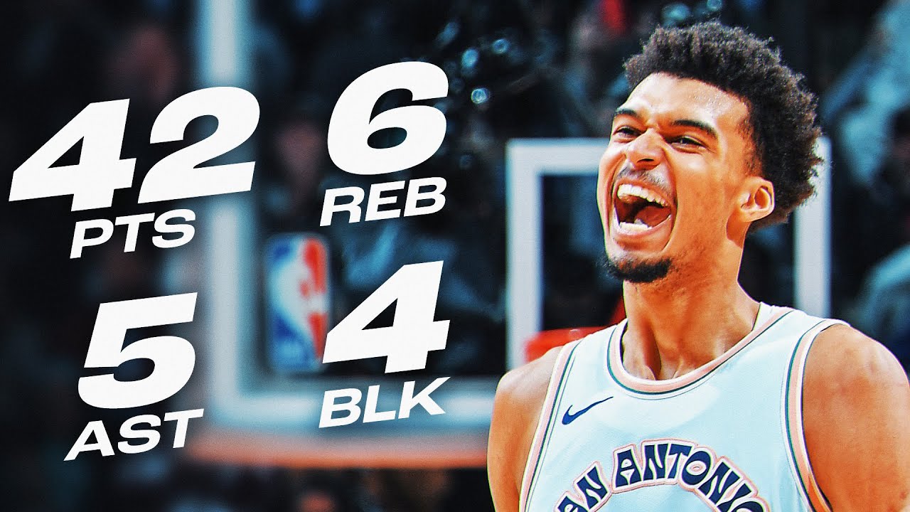 LAL (30-19) 04h00Dans la victoire en prolongation des Spurs sur les Hawks 133 à 126, Victor Wembanyama noircit la feuille de stats avec 42 points (dont 8 dans les cinq dernières minutes) à 13/24 aux tirs dont 7/15 à trois points, 9/12 aux lancers francs dont 2 LF dans le money time, 6 rebonds, 5 passes décisives, 4 contres et 2 interceptions en 37 minutes de temps de jeu. Devin Vassell ajoute 23 points, 20 points de Jeremy Sochan et 12-7-8 pour Chris Paul.