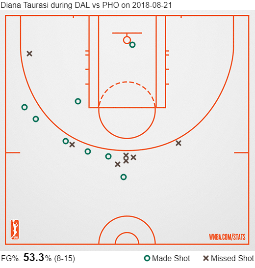 Car la suite du match sera à sens unique. Le Mercury étouffera Dallas et prendra le large lors du troisième quart-temps remporté 26-15 avant de maitriser la fin de match, comptant même 20 points d’avance. Phoenix est resté sur sa lancée offensivement et a su resserrer les boulons en défense à l’intérieur, ce qui a forcé Dallas à prendre des tirs de loin mais malheureusement pour elles la réussite n’était pas au rendez-vous. Diana Taurasi aura fait extrêmement de mal à Dallas, terminant avec un beau 6/12 de loin. On vous laisse analyser la shot chart de celle qui en est maintenant à 12 victoires pour 0 défaites dans les matches à élimination directe.