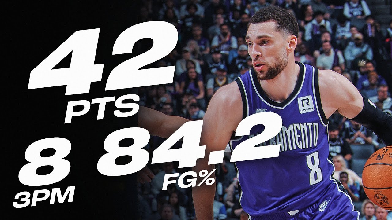 POR 125 (23-28) Dans la nette victoire des Kings sur les Hornets 130 à 88, Zach LaVine score la bagatelle de 42 points à une adresse folle de 16/19 aux tirs dont un terrible 8/9 à trois points, 2/3 aux lancers francs et 3 rebonds en seulement 31 minutes de temps de jeu. Il reste des miettes pour DeMar DeRozan, 18 points et 7 rebonds et Malik Monk, 13 points.